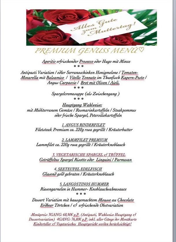 Liebe Gäste, genießen Sie mit ihren Liebsten ein besondres genussvolles Muttertags-Menü, frische deutsche Spargel Variationen in unserem stilvollen Fachwerk Ambiente zum Wohlfühlen und genießen.Lassen Sie sich begeistern Muttertag haben wir für Sie ab 12.00 bis 22.30 Uhr durchgehend geöffnet.